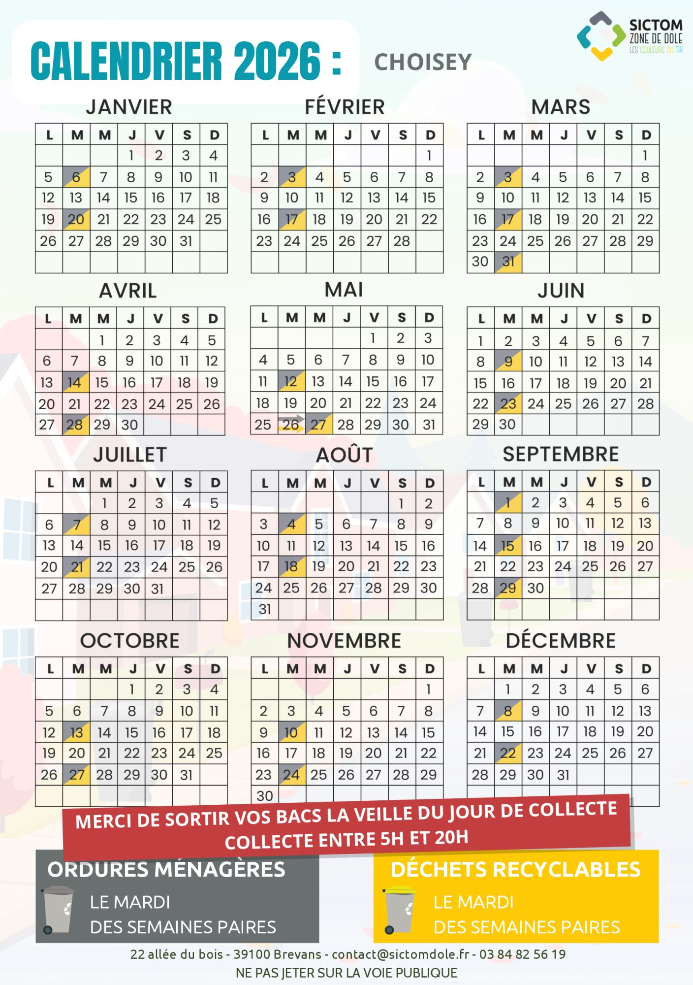 RAPPEL : lorsqu’il y a un jour férié en semaine, la collecte du jour férié est décalée au jour suivant c’est-à-dire le mercredi pour Choisey.